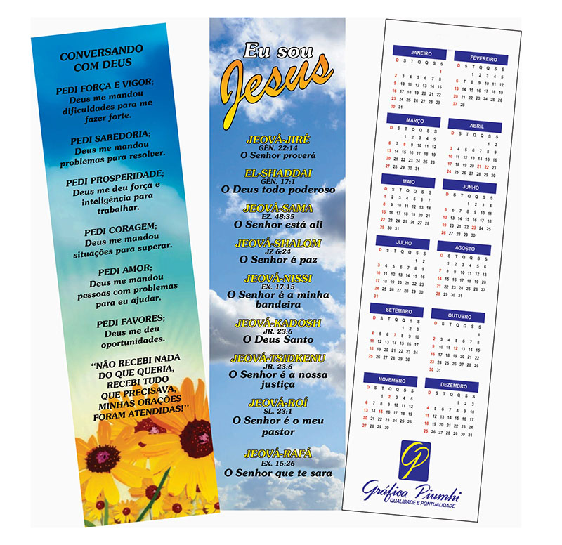 Cartões de Visita; Bloco; Cartaz; Comandas; Envelope; Folhinha; Folder; Marcador de livro; Pasta; Panfleto; Postal; Receituário; Tag; Talões.